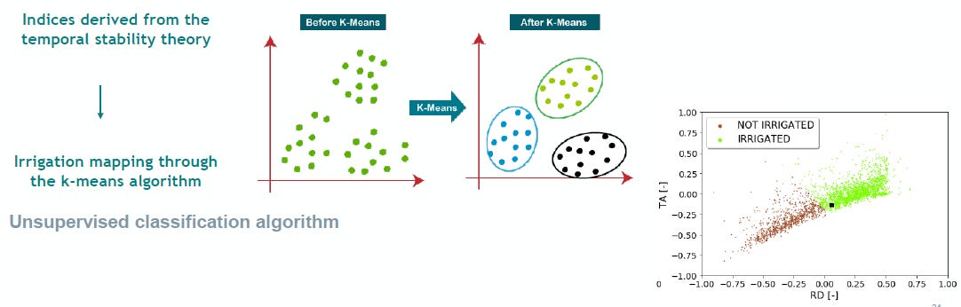 In each Irrigation mapping product, the presence or absence of irrigation is discovered, by examining an anomaly. The environmental parameter that is most closely influenced by irrigation is Soil moisture and thus intra-season soil moisture anomalies are a reliable way to map irrigation. Two prominent examples of the use of the soil moisture proxy are found in papers published through the Irrigation + project, DARI model [16] (based on temporal stability of the soil moisture signal) and the S2IM model [17] which uses both Sentinel 1 and Sentinel 2 data synergistically to produce field scale irrigation maps in Spain and Italy.